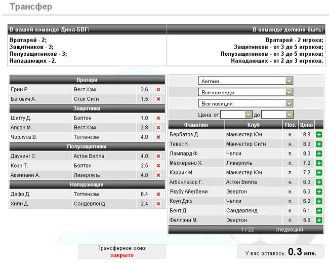 - область выборки по определенному критерию: страна, команда, позиция, диапазон цен. По умолчанию выбрана страна Англия, все команды, все позиции, весь диапазон цен;