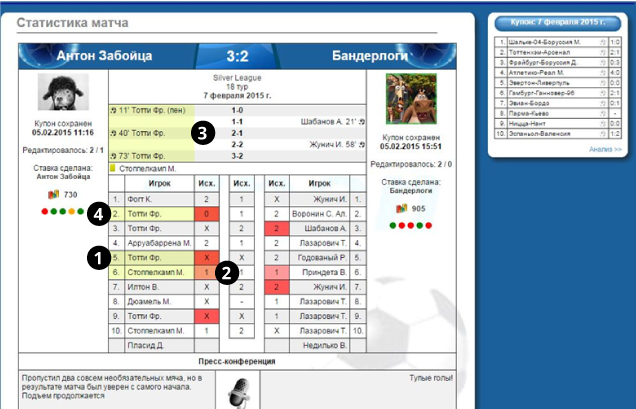 Гол забивается, когда ты угадал исход матча, а противник – нет (№1 на рисунке).